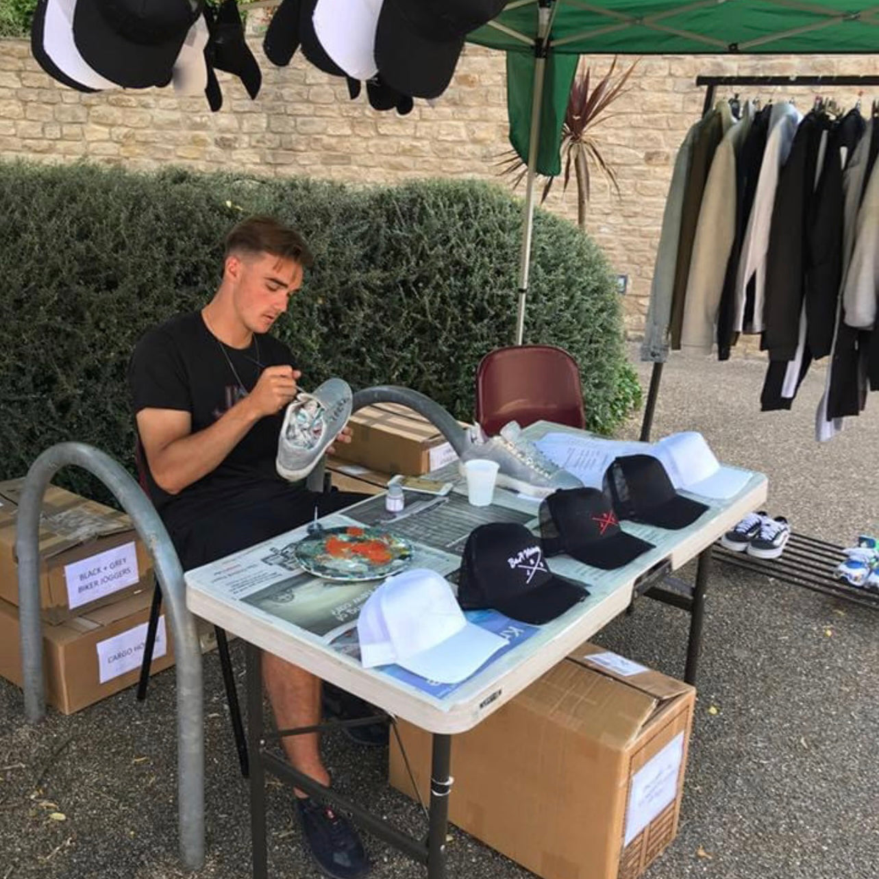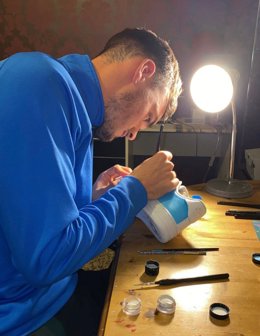 In 2018 JRD Clothing launched by founder John Robert Dennis. The brand inception evolved around creating bespoke hand painted goods working with classic footwear silhouettes, such as the Nike Air Force 1. John worked closely with each client to create products that were unique and personal to their story, and following local purchases the brand began to build traction in his hometown of Oxfordshire.